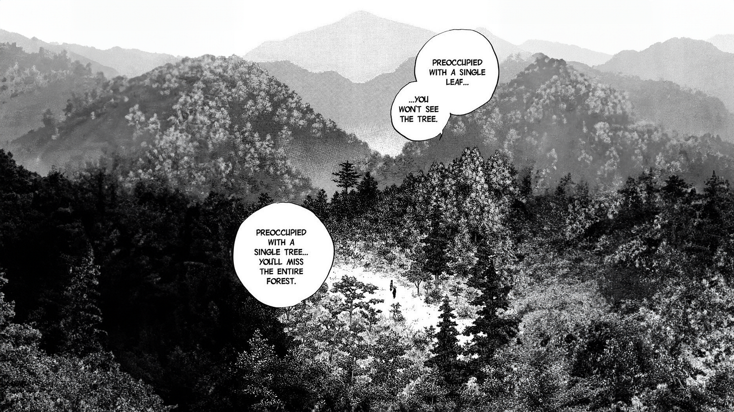 Anyway, Vagabond recounts a fictitious story of Musashi Miyamoto, one of the greatest samurai to ever live. It illustrates the growth and transformation of a young, impulsive warrior to a more enlightened, disciplined individual as he explores mastery of the way of the sword. Here is a page from the book that particularly resonated with me. Remember to zoom out for the bigger picture. We are more insignificant than we think.